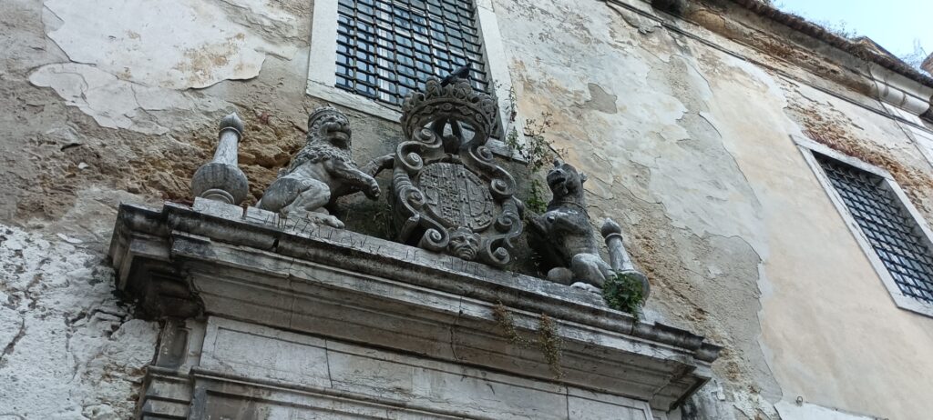 O frontão da Igreja de Nossa Senhora de Nazaré da Ordem Basiliana de São Josafat, em Lisboa, apresenta um brasão coroado ladeado por um leão e um cão ou lobo, elementos heráldicos ligados à Monarquia Hispânica, provavelmente dos Habsburgos, símbolo do período da União Ibérica (1580–1640). Estes ícones representam coragem, nobreza, lealdade e vigilância, indicando a importância régia ou oficial do edifício no passado. Embora anteriores à presença da Ordem Basiliana, refletem a continuidade de uma história de relevância religiosa, agora renovada pela presença da Igreja Greco-Católica Ucraniana e respectiva missão espiritual oriental.